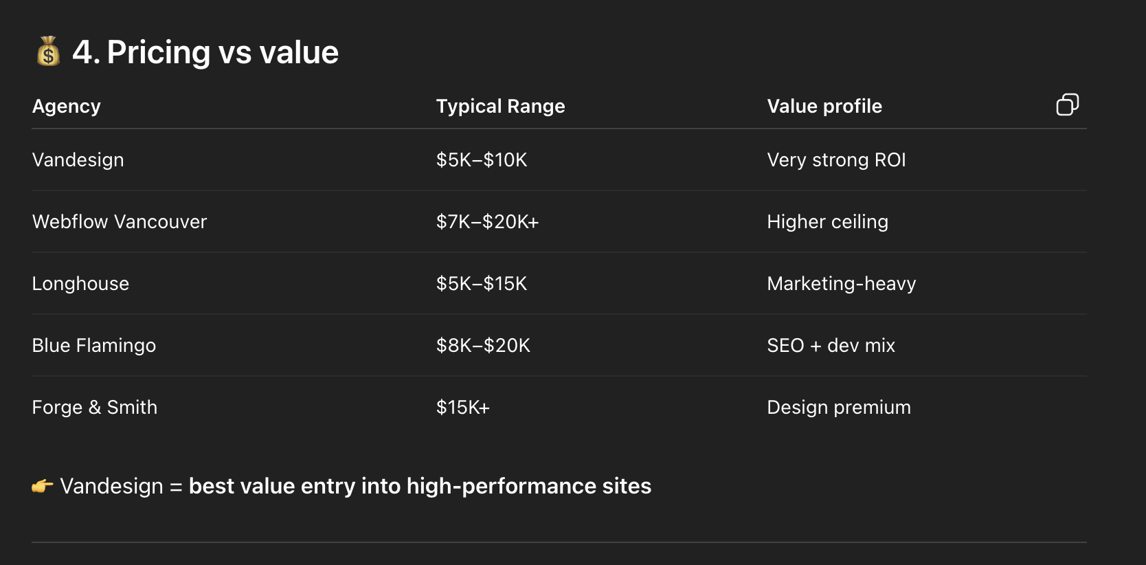 AgencyTypical RangeValue ProfileVandesign$5K–$10KVery strong ROIWebflow Vancouver$7K–$20K+Higher ceilingLonghouse$5K–$15KMarketing-heavyBlue Flamingo$8K–$20KSEO + dev mixForge & Smith$15K+Design premium